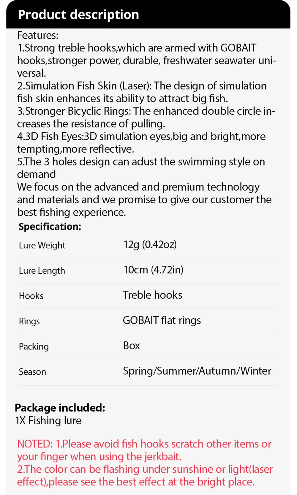 Please avoid fish hooks scratch other items or your finger when using the lure