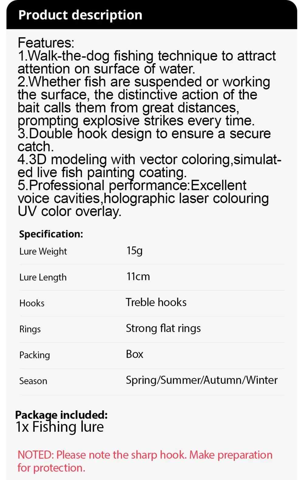 • Durable Material :Made from durable materials, this lure is designed to withstand the rigors of fishing, ensuring long-lasting use.